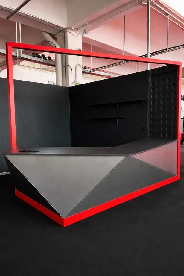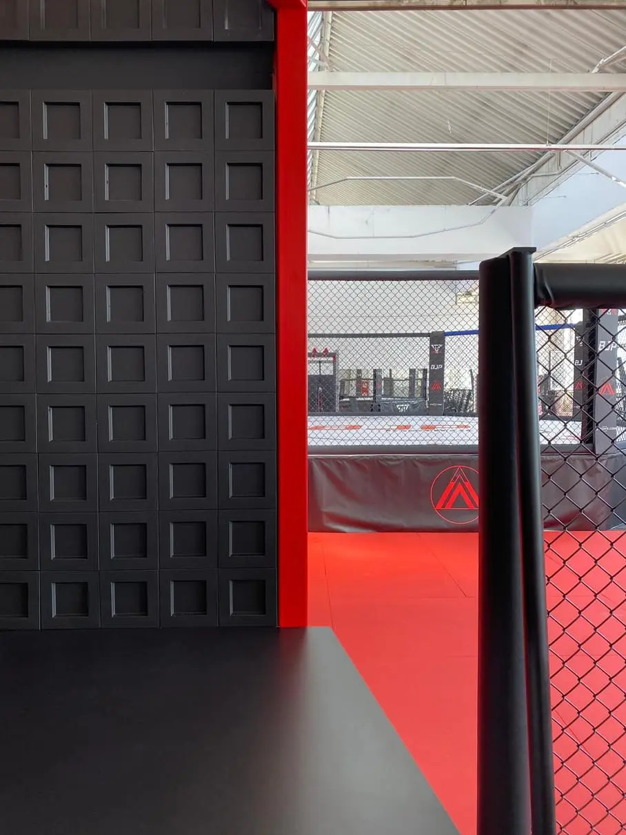 Samotná recepce je výrazným solitérem prostoru. Navrhli jsme ji v barvách značky a dali jí tvrdý, ostrý tvar – bez zaoblení a kompromisů. Stejně jako toto bojové umění působí přímočaře, disciplinovaně a s jasným postojem.