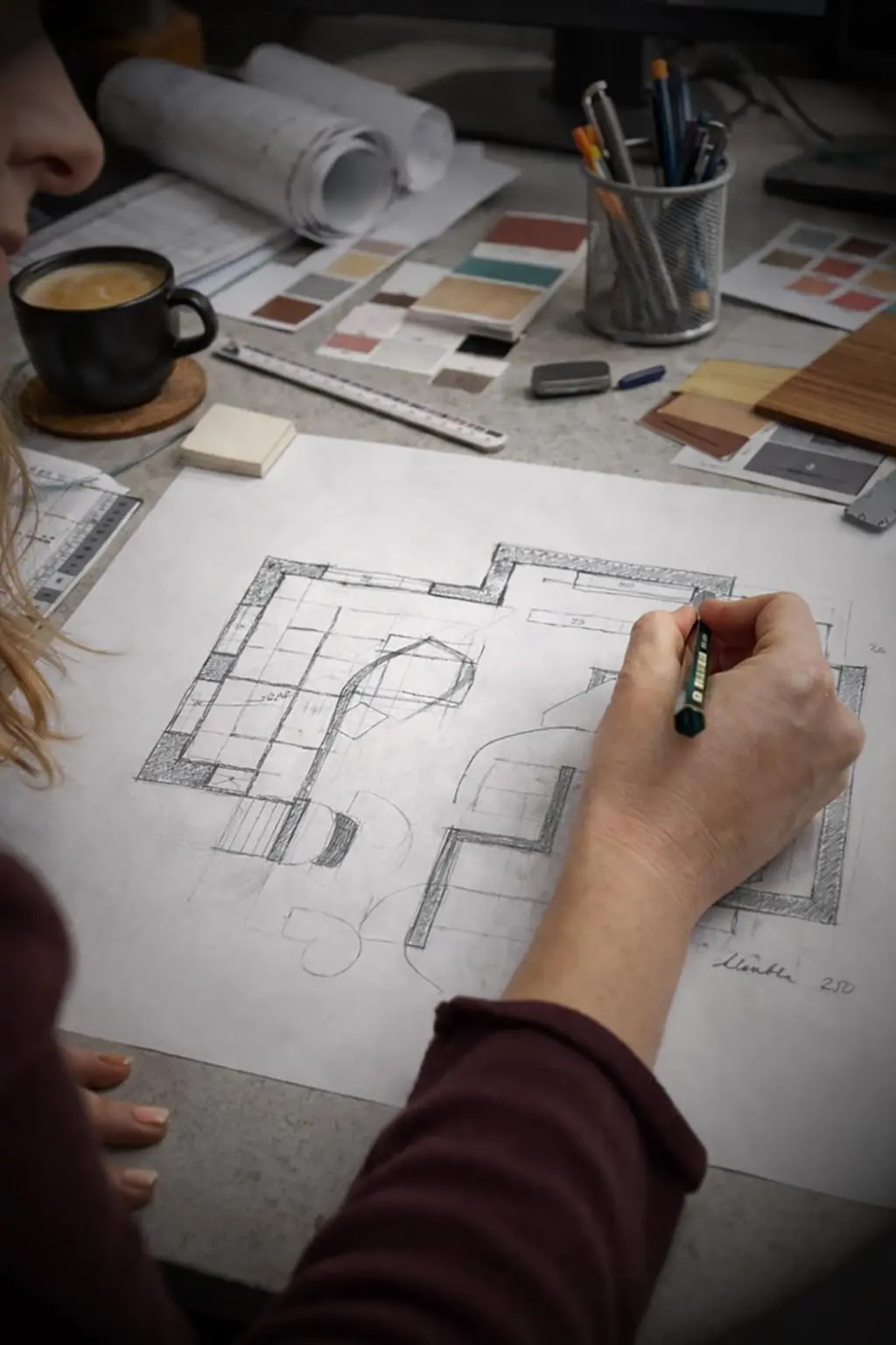 Ke každému projektu přistupujeme individuálně. Pracujeme s prostorem komplexně - od estetiky, přes akustiku či osvětlení, až po technické výkresy, aby byl nejen vizuálně působivý, ale také příjemný pro život i práci.