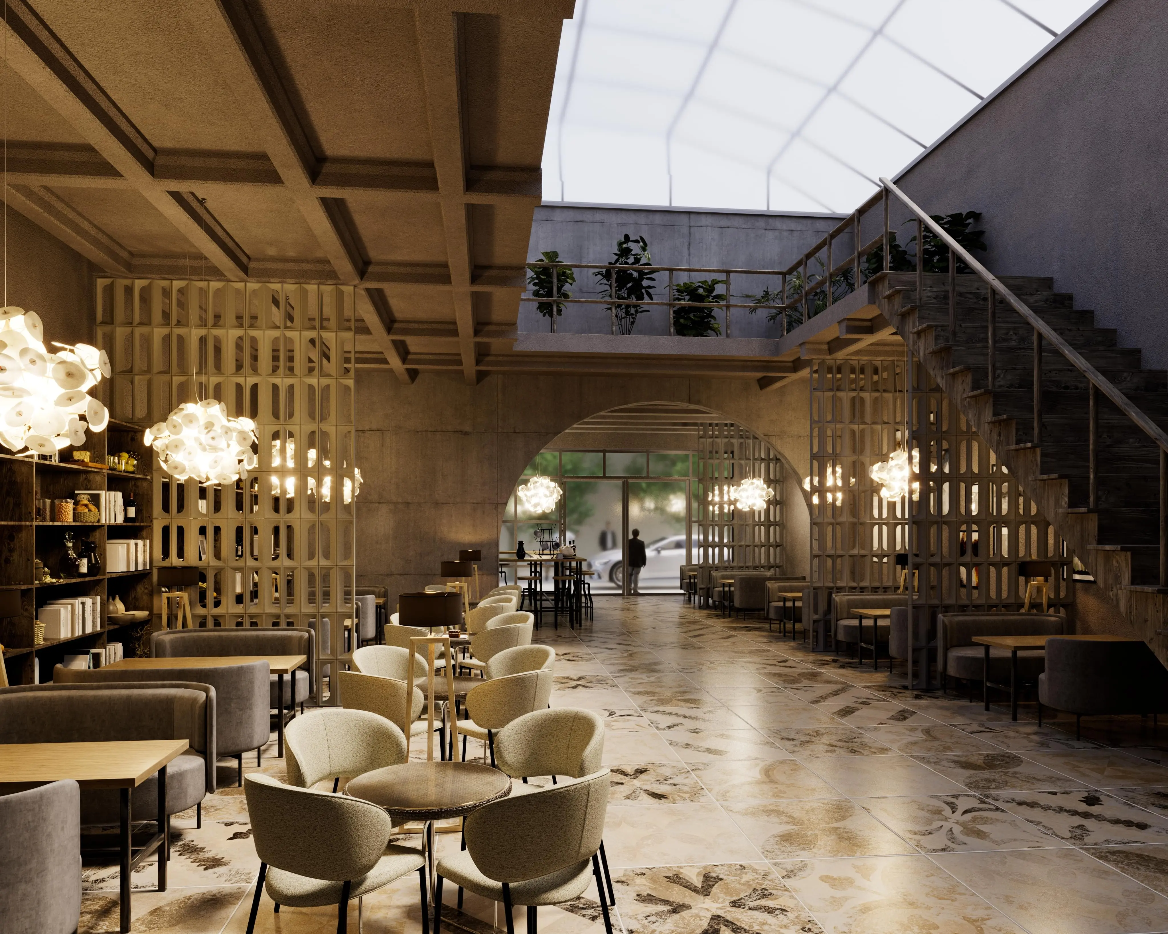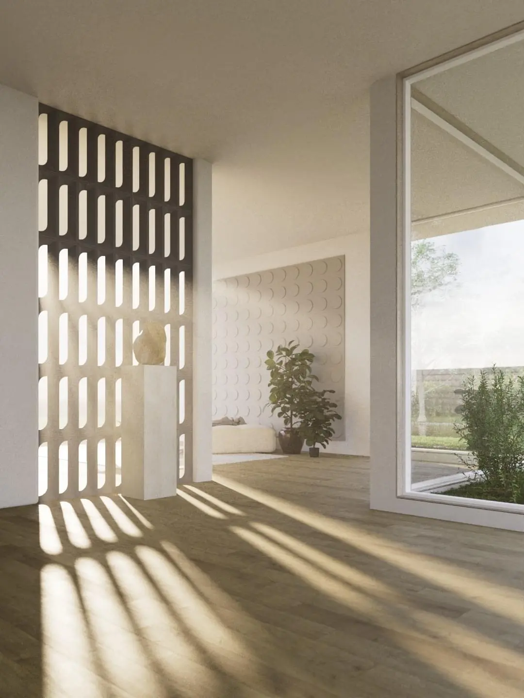 Betonová příčkovka pro částečné oddělení prostoru bez ztráty světla a vzdušnosti. Plastický tvar vytváří přirozenou hru světla a stínu a dodává stěně architektonický výraz.