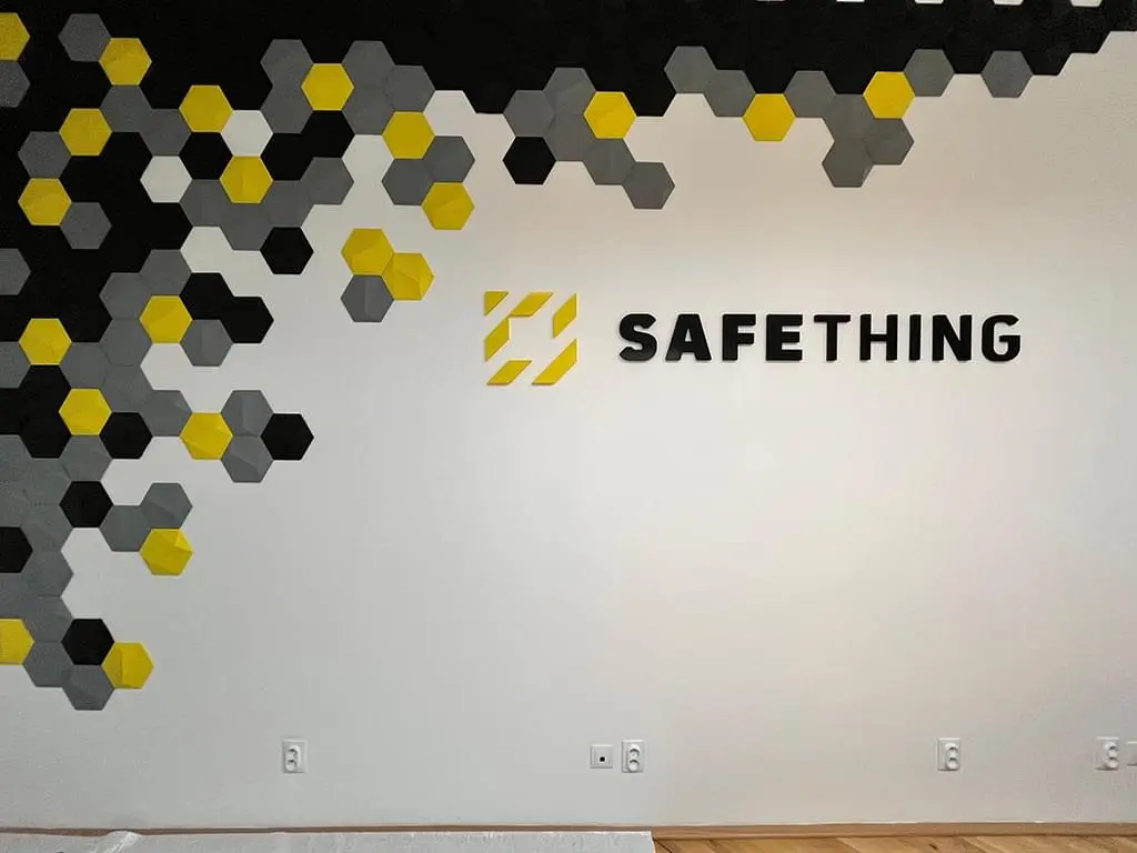 V zasedací místnosti jsme realizovali prostorovou stěnu z modulárních hexagonových prvků navržených v brandových barvách společnosti. Barevná skladba i rozmístění jednotlivých prvků vychází z vizuální identity klienta a převádí grafický princip značky do architektonického měřítka.